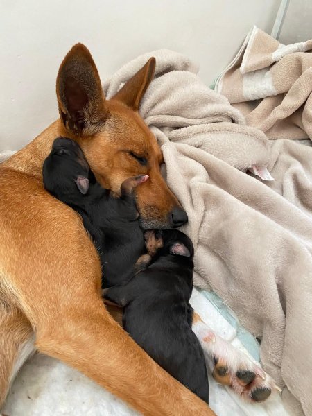 Gelukkig kon ze terecht bij een fijn opvanggezin op het platteland, waar ze in alle rust en veiligheid vijf gezonde pups ter wereld heeft gebracht. Ze is een ontzettend zorgzame en liefdevolle moeder geweest voor haar pups. Alle pups zijn ondertussen geadopteerd.