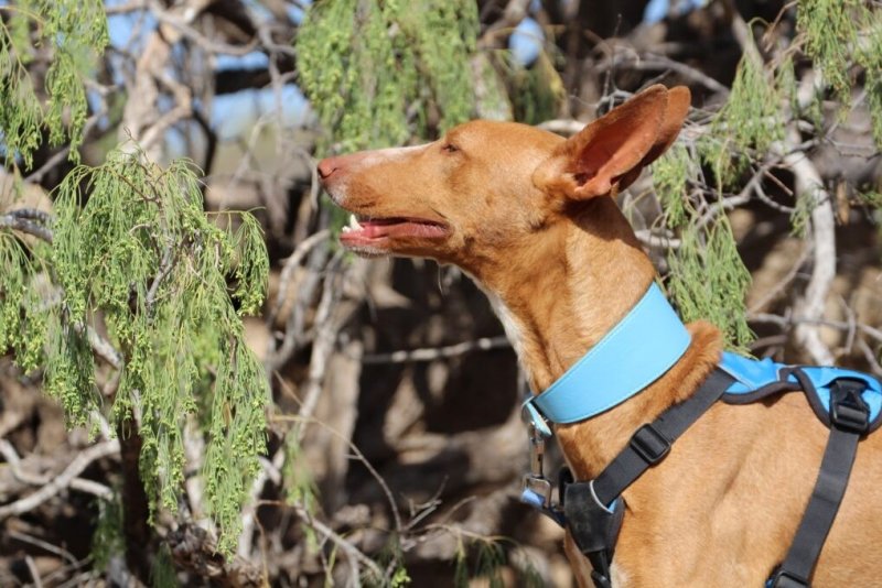 Aan de lange riem rondom het asiel vindt hij het fijn om alles op zijn tempo te besnuffelen en ontdekken.