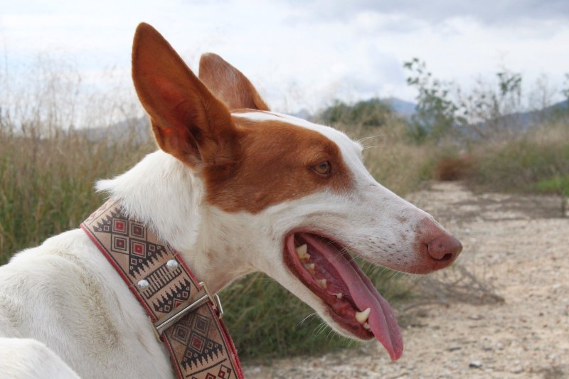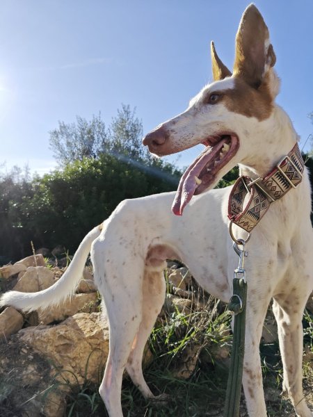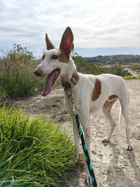 Buiten is Alfred een echte Podenco en een jager in hart en nieren. Hij geniet aan een lange lijn van alle geurtjes en indrukken, maar als hij iets op het spoor is kan hij ook best even sterk zijn. Alfred kan zonder problemen met teefjes samenleven, reutjes zijn niet altijd een goed combinatie met Alfred. Met katten, konijnen en kippen kan hij ook niet samen.