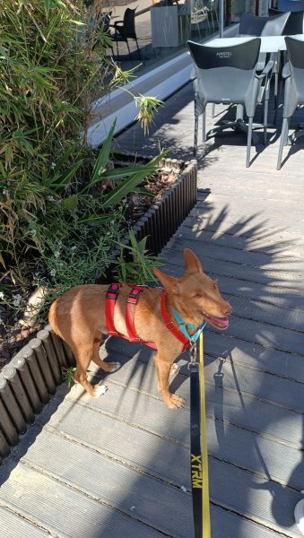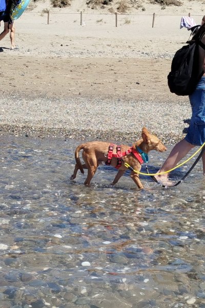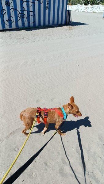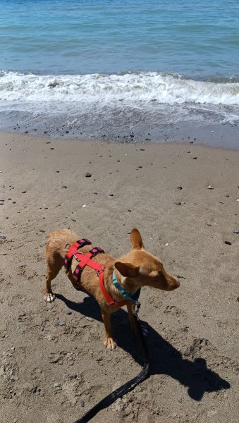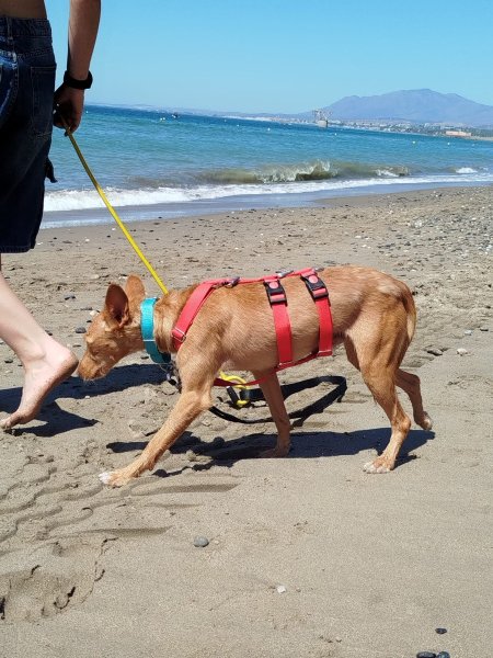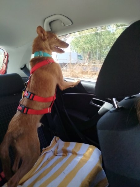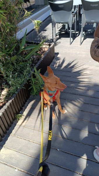 Nemo mocht onlangs een dagje mee uit met een vrijwilliger. In de auto was hij voorbeeldig: eerst keek hij nieuwsgierig uit het raam, daarna ging hij rustig zitten en genoot van het ritje. In drukkere straten vond hij de herrie eerst wat spannend, maar hij raakte er al snel aan gewend. Naarmate de wandeling vorderde, werd hij steeds zelfverzekerder en nieuwsgieriger. Op het strand genoot hij volop – snuffelend door het zand en spelend in het water.