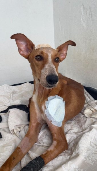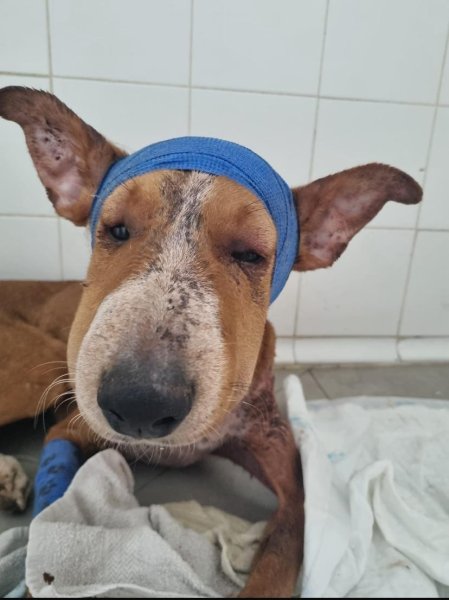 Zij is een aantal maanden geleden zo door iemand toegetakeld dat ze bijna dood was, met haar laatste krachten wist ze te ontsnappen en stond ze bij mensen voor de deur die haar, terwijl ze inmiddels ingestort was, met spoed naar de dierenarts hebben kunnen brengen.