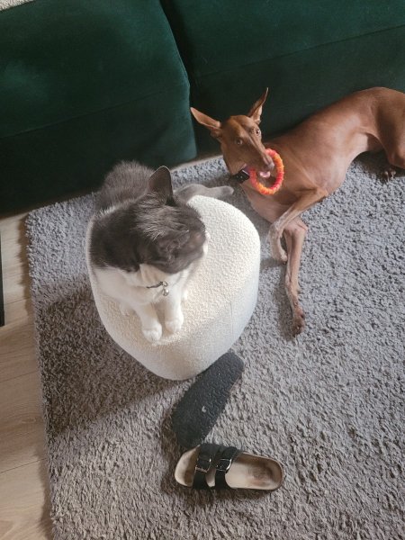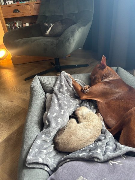 In huis is Saul aanhankelijk en zoekt hij graag contact met zijn mensen. Met de katten in huis gaat het wisselend: soms ligt hij er rustig naast, soms is hij te lomp of jaloers. Daarom plaatsen we hem liever in een huis waar geen katten zijn, of waar men hier heel zorgvuldig mee kan omgaan. Een stabiele hondenvriend zou voor hem veel rust en balans brengen.