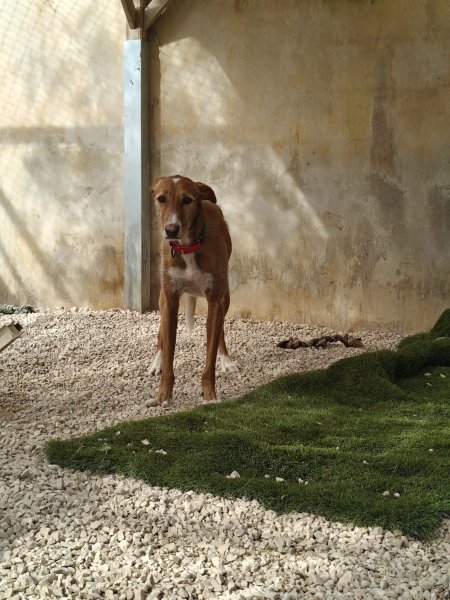 Hoewel Merlin een echte Podenco is, is hij gek op water! Hij kan zich goed vermaken in een laagje water en ligt er ook graag in tijdens een warme dag in Spanje. Merlin is een klimmer en is in het asiel over een 2,2 meter hoge omheining geklommen. Een goed hoge en stevig omheinde tuin is een must. Merlin kan goed overweg met teefjes en met sommige reutjes.