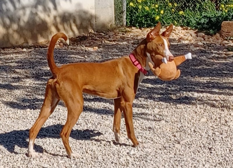 Denis is een kleine speelse jonge podenco die beweging en aandacht nodig heeft. Hij speelt graag met andere honden en ziet mensen en kinderen als de beste speelmaatjes. Omdat Denis een kleine podenco is was er al snel belangstelling voor hem. Hij werd meegenomen door een Spaanse familie die na een korte kennismaking super enthousiast waren. Echter thuis gekomen kwamen ze tot de ontdekking dat Denis nog helemaal niet gewend was om te leven in een huis, dat alles nieuw voor hem was en overweldigend. Hij had verlatingsangst, hij begreep niet dat hij niet mee kon als de familie weg ging en ook de eerste nacht vond hij het erg dat hij alleen werd gelaten en niet bij de familie mocht zijn. En geloof het of niet........na de eerste nacht, binnen 24 uur werd Denis ontredderd terug gebracht naar het asiel. De reden???? Ze wisten niet hoe ze met een jonge hond om moesten gaan, spraken duidelijk niet de hondentaal.