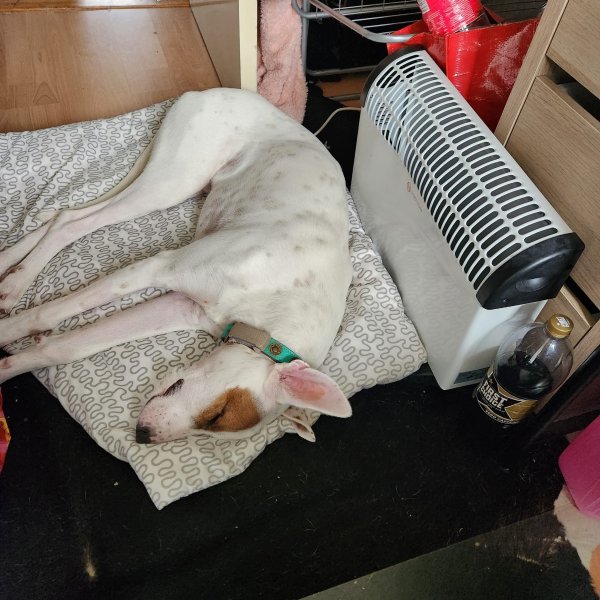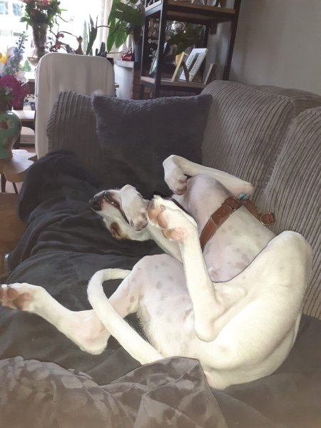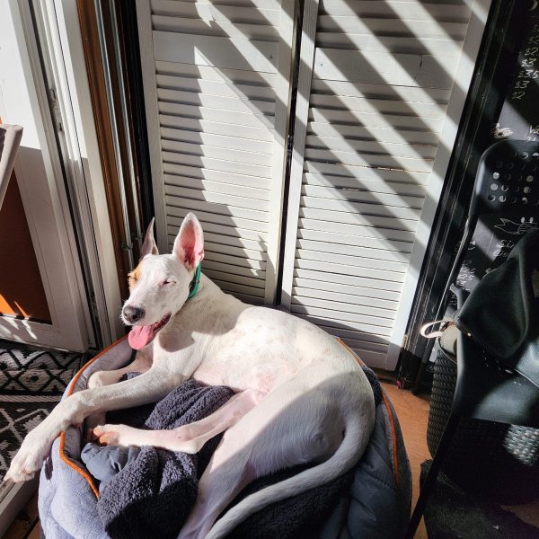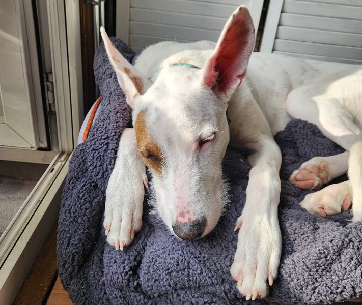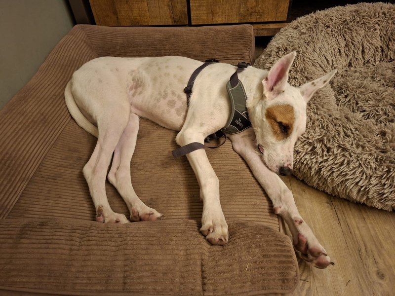 Charly is vandaag aangekomen bij zijn nieuwe opvanggezin. Na een eerste ronde om alles goed te besnuffelen en een flinke slok water, is hij uit zichzelf lekker gaan liggen om even bij te komen. Het is allemaal nog best wel spannend voor hem, maar hij doet het ontzettend goed.